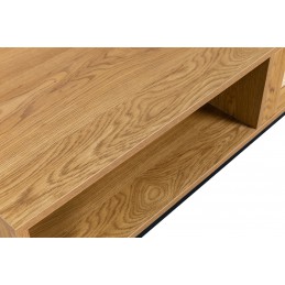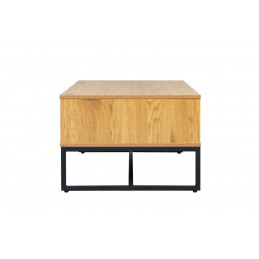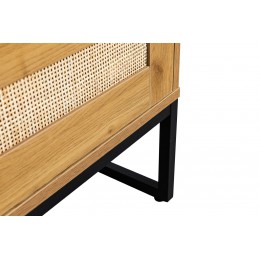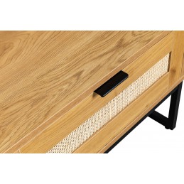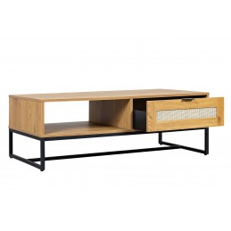 Stolik kawowy w stylu boho z rattanowymi frontami to idealny mebel do sypialni lub salonu w naturalnych, jasnych kolorach. Stolik Capri pozwoli na przechowywanie nie tylko ksiązek czy pilota od TV, ale również innych drobnych przedmiotów. Stolik stoi stabilnie dzięki metalowej podstawie. Nogi stolika Capri zostały polakierowane proszkowo na czarno. Dębowa okleina, którą został wykończony mebel, niezwykle dokładnie imituje naturalny kolor oraz teksturę drewna. Swoją wytrzymałość stolik zawdzięcza trwałym materiałom jak płyta MDF, z której wykonany został korpus oraz metal użyty na podstawie. Front pojemnej szuflady w środku wykonane zostały z naturalnego rattanu. Naturalny rattan to nie tylko niewiarygodnie dobrze wyglądający materiał. Rattan przede wszystkim gwarantuje cyrkulację powietrza w komodzie.