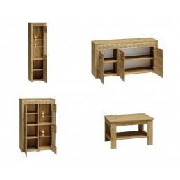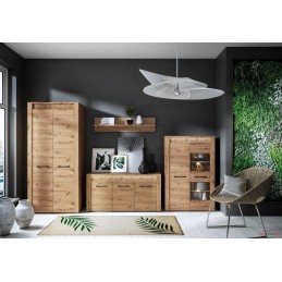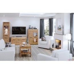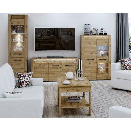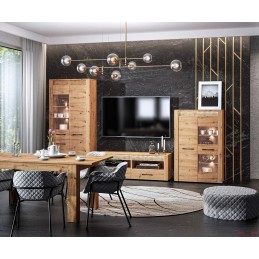 Nowoczesna kolekcja ARTAS została zaprojektowana do umeblowania estetycznego i funkcjonalnego pokoju dziennego. Postawiono na prostotę, oszczędne i surowe formy oraz industrialny charakter. Cały wyraz kolekcji ociepla jej faktura – naturalne słoje i sęki dębu artisan. Wyrafinowana, ryflowana i podświetlana wstawka, nada designerskiego blasku oraz powiększy optycznie przestrzeń. Ciemne uchwyty natomiast okraszą całość loftowym klimatem.